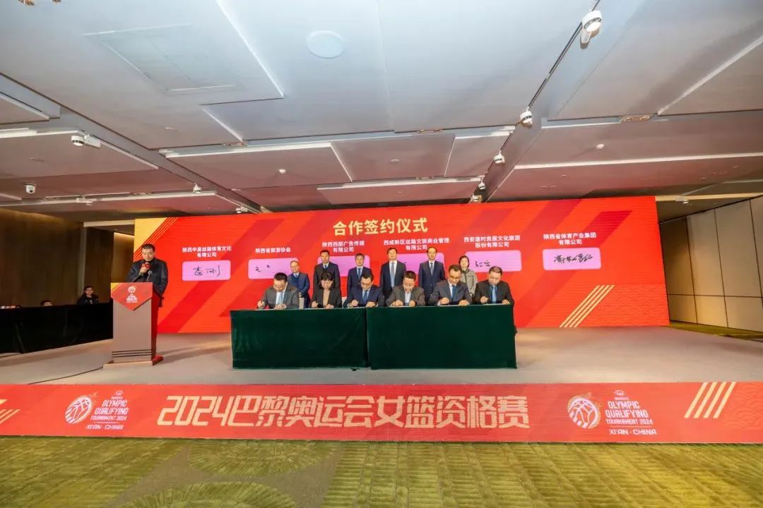1月20日,2024巴黎奥运会女篮资格赛合作签约仪式在西安举行。陕西省体育局、陕西省商务厅、陕西省文化和旅游厅、陕西旅游集团有限公司、西安市体育局、西安市高新区管委会、陕西省篮球排球运动管理中心等单位负责同志出席并见证签约。